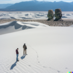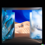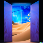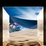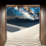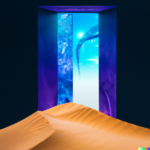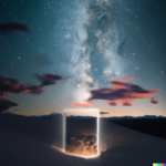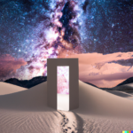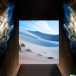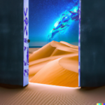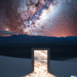 I spent quite a bit of time today devoted to a couple of subjects. One centered around the idea of a doorway in space-time through which alternate views of reality might flow. The other theme involved Platonic solids caught up in frenzied situations. A sample prompt for the door images is, “a doorway which is a portal to a magnificent starry sky, in a desert. white sand dunes, mountains in the distance, dramatic lighting”. The other prompts were similar. Below is a sample set of generations from those prompts: