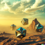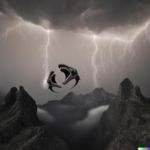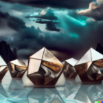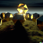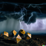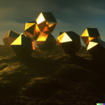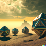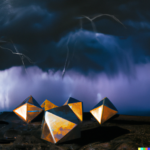 The images of the Platonic solids resulted from prompts similar to this one, “realistic, detailed Platonic solids are cavorting with djinns in lightning storm, on a stark landscape, dramatic lighting”. Below are some resulting images: