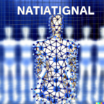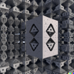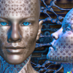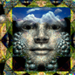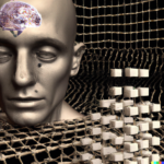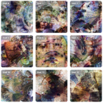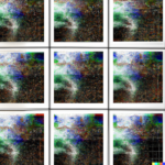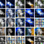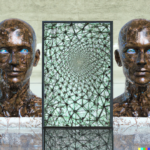 Having achieved some kind of baseline imagery of the actual structure of the network, I wanted to add a symbolic layer by including references to the AI’s “self” in the prompts. As expected, DALL-E’s training data contained a lot of human images tagged with “self”, creating a tendency for any request for self-representation to trend toward human forms, if that word appears in the prompt. Anthropomorphizing the process—as we are wont to do with AIs—I consider this a more metaphorical interpretation of AI self, whereas the grid images above seem more literal.