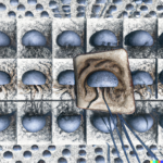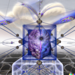 The next set of illustrations comprises images created from prompts for the AI to generate images of a neural network generating images. I consider this to be an operative, recursive definition of a self portrait for such as system, and the correspondences are obvious with the neuron images seen above. Here DALL-E has generated some system-level interpretations of its own internal configurations. Please note that all my DALL-E images are first generation and are not subjected to editing or variations, unless so noted.