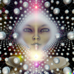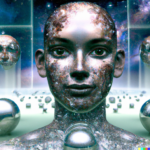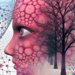 Having achieved some kind of baseline imagery of the actual structure of the network, I wanted to add a symbolic layer by including references to the AI’s “self” in the prompts. As expected, DALL-E’s training data contained a lot of human images tagged with “self”, creating a tendency for any request for self-representation to trend toward human forms, if that word appears in the prompt. Anthropomorphizing the process—as we are wont to do with AIs—I consider this a more metaphorical interpretation of AI self, whereas the grid images above seem more literal.
