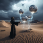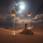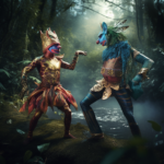 As in my post “Problem with dissimilar actors”, I am basically unable to place discretely dissimilar actors into the same scene. Given that fact, I am concentrating on what I can do—and to that end I had some productive image generating sessions over the last two days. Below are some samples. They are loosely categorized by four themes that seemed to emerge as I worked with MJ.