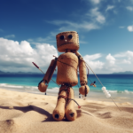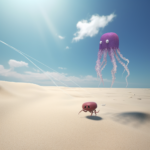 For example, I can generate images with a voodoo doll actor and it looks as I intend; I can likewise generate images with an electric jellyfish actor and it looks as I intend. However this kind of prompt is proving problematic for me: “an electric jellyfish is chasing a voodoo doll on the beach under a bright sky”. As shown below, each actor is now some awkward mix of doll and jellyfish—which is not at all what I want.