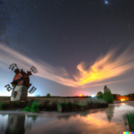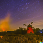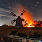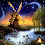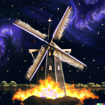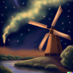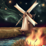 I decided to do a series of windmill generations with this prompt: “a burning windmill on a riverbank, surrounded by supplicating zephyrs, under a starry sky”. The results are below.
